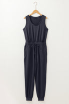 Black Casual Tank Style Tie Waist Pocketed Jogger Jumpsuit