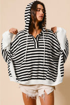 Black white Oversized Striped Henley Buttons Dolman Sleeve Hooded Top