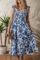 Blue Floral Ruffle Strap Square Neck Smocked Bodice Midi Dress