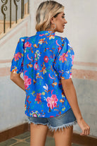 Blue Floral Short Puff Sleeve Button Up Shirt