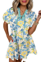 Blue Floral Striped Trim Puff Short Sleeve Dress