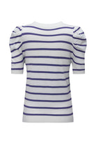 Blue Stripe Ribbed Trim Round Neck Bubble Sleeve Knitted Top