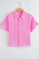Collared neck, buttoned front, ruffled short sleeves and relaxed fit.