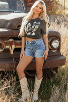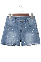 Dusk Blue Pearl Beaded Raw Hem Medium Wash Denim Shorts