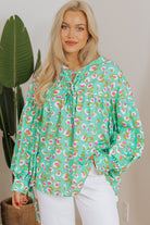 Green Abstract Printed Lace-up Lantern Sleeve Babydoll Blouse