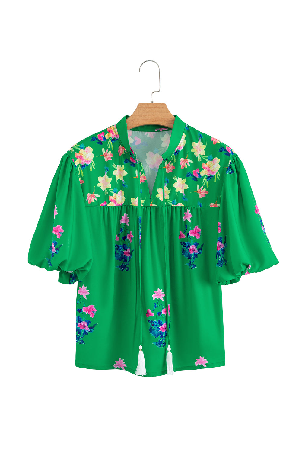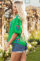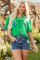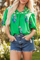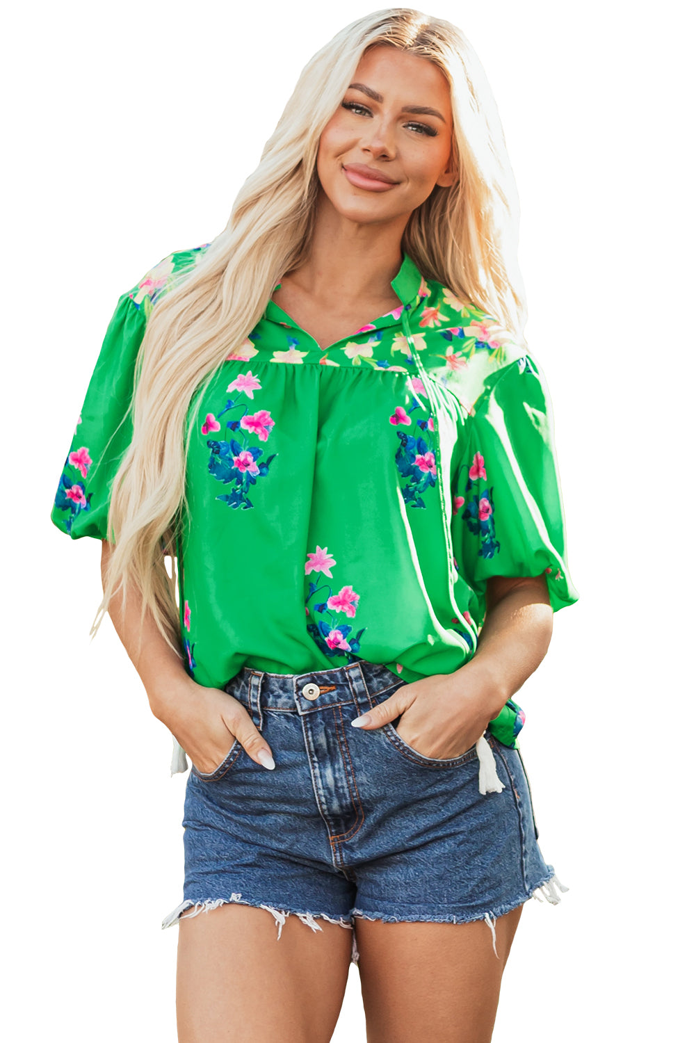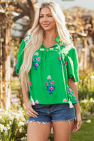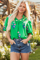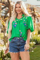 Green Floral Detail Tie Split Neck Short Sleeve Blouse