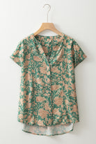 Green Floral Print Pleated Buttoned V Neck Short Sleeve Blouse