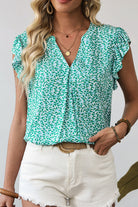 Green Notched V Neck Leopard Ruffle Short Sleeve Blouse