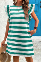 Green Stripe Flutter Sleeve Round Neck Shift Dress