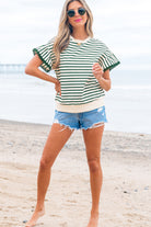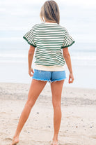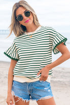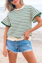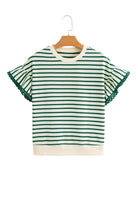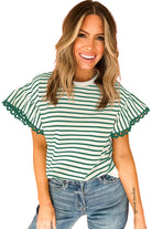 Green Stripe Scallop Lace Trim Ruffle Short Sleeves Crewneck Top