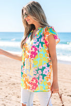Multicolour Leopard Flutter Sleeve V Neck Crinkled Blouse