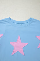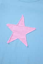- Trendy oversize T-shirt features a frayed denim star patch for a unique and edgy look.