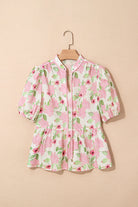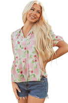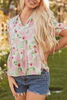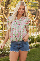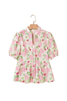 Pink Floral Print Drawstring V Neck Peplum Blouse