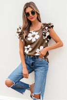 Pink Floral Textured Ruffled Short Sleeve Square Neck Blouse