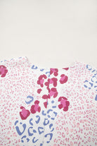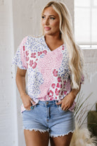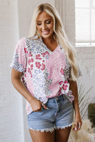 Pink Mixed Leopard Print V Neck Short Sleeve Blouse