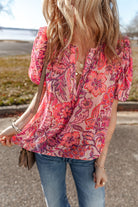 Red Floral Print Ruffled Puff Short Sleeve Blouse