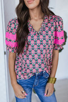 Sachet Pink V-Neck Ruffle Abstract Floral Print Puff Sleeve Top