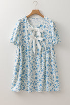 Sky Blue Floral Contrast Bow Puff Sleeve Mini Dress