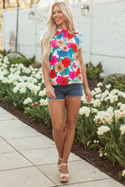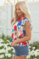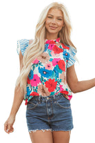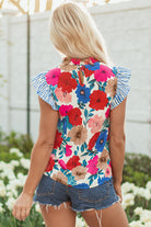 Sky Blue Floral Mock Neck Striped Flutter Sleeve Blouse