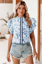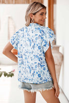 Sky Blue Floral Print Ruffled Short Sleeve Blouse