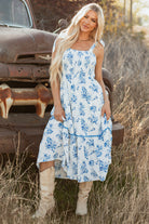Sky Blue Floral Print Shirred Knot Shoulder Sleeveless Long Dress
