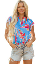 Sky Blue Floral Print V Neck Pompom Trim Flutter Sleeve Blouse