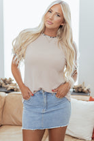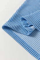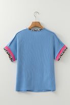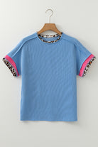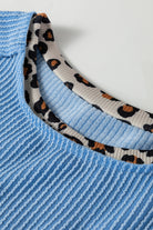 Sky Blue Leopard Patchwork Corded Knit Crew Neck T Shirt
