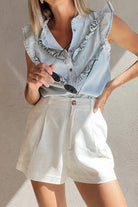 Sky Blue Mineral Wash Frilled Button Up Denim Shirt