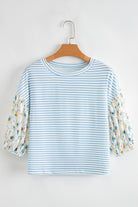 Sky Blue Stripe 3/4 Floral Puff Sleeve Patchwork Drop Shoulder Top