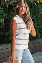 Sky Blue Stripe Split V Neck Collared Ribbed Sweater Vest