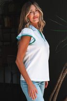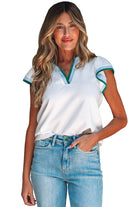 • The contrast striped trim adds a fun pop of color to this summer blouse.