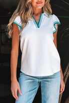 White Color Contrast Ruffled Sleeve Collared V Neck Blouse