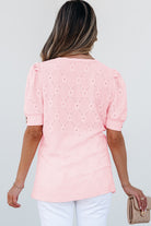 White Flower Geometric Textured Button Short Sleeve Top