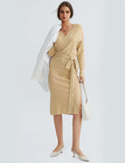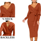CHERFLY Women's V Neck Sweater Dresses Batwing Long Sleeve Backless Bodycon Long Dress with Belt