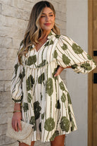 Guacamole Green Floral Striped Print Contrast Piping Puff Sleeve Dress