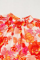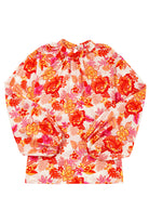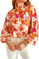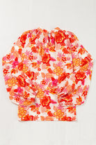 Orange Floral Print Pearl Button Keyhole Long Puff Sleeve Blouse