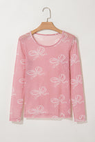 Black Round Neck Bow Print Long Sleeve Mesh Top