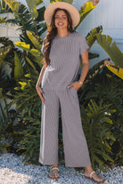 Bright Green Solid Corded Knit Short Sleeve T Shirt and Wide Leg Pants Set
