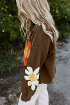 Coffee Big Flower Pattern V Neck Drop Shoulder Sweater