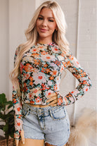 Orange Floral Mesh Slim Long Sleeve Crop Top