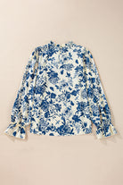 Sky Blue Floral Print Flounce Sleeve Keyhole Back Blouse