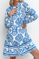Sky Blue Tribal Print Button Up Notch Neck Loose Mini Dress