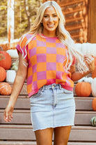 Strawberry Pink Colorblock Plaid Pattern Ribbed Trim Sweater Tank Top