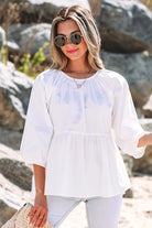 White Bow Knot Cutout Back Loose Fit 3/4 Sleeve Blouse