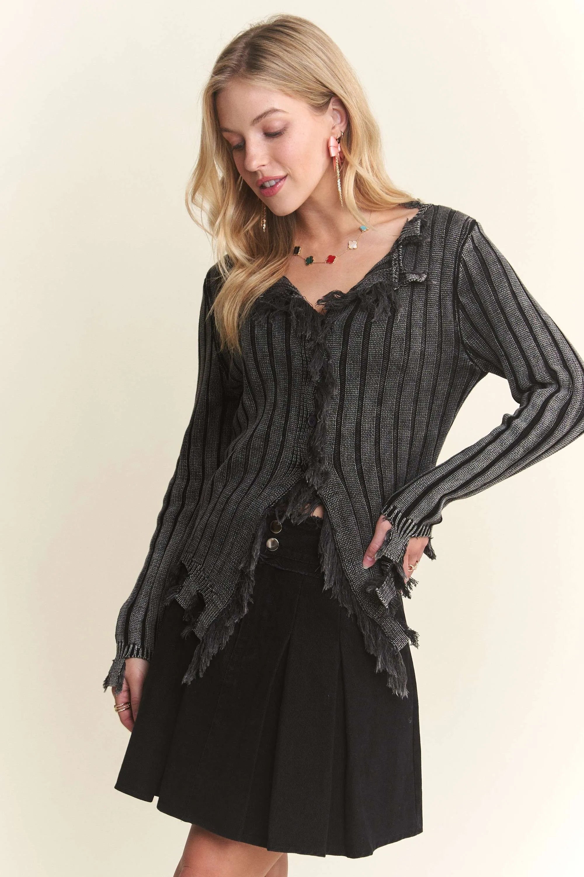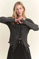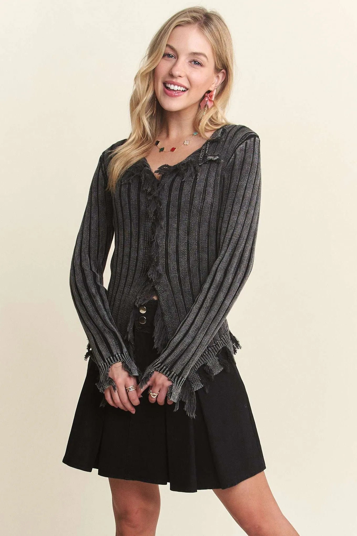 The distressed edge washed sweater is a trendy and edgy addition to your closet. The distressed edges give this sweater a cool and laid-back vibe, perfect for a casual and stylish look. The washed effect adds a vintage and worn-in feel to the sweater, adding to its unique charm. Pair it with your favorite jeans or leggings for a relaxed yet fashionable outfit. Embrace the rugged and casual appeal of this distressed edge washed sweater for a modern and trendy ensemble.