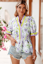 Purple Floral Print Striped Detail Split Neck Flounce Short Sleeve Peplum Blouse
