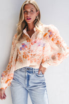 White Floral Print Collared Balloon Sleeve Loose Shirt
