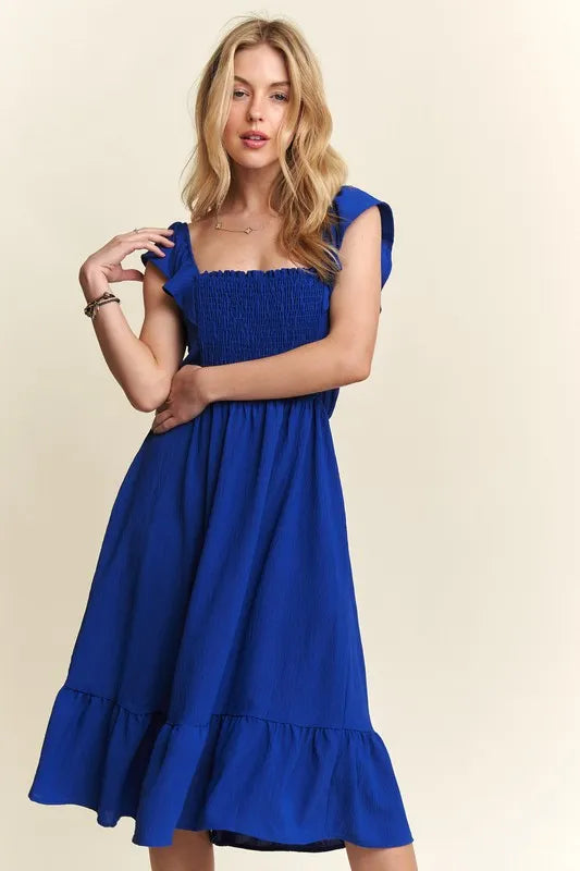 ADORA Smocked Square Neck Ruffled Cap Sleeve Dress