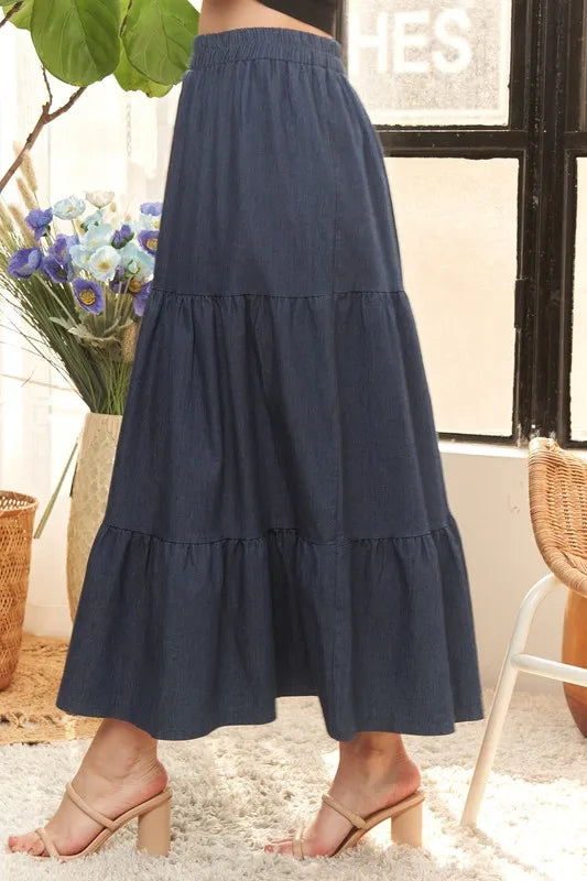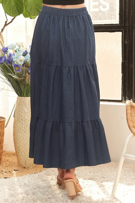 ADORA Waist Band Tiered Denim Maxi Skirt