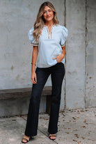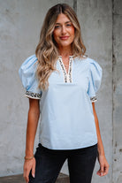 Beau Blue Contrast Leopard Trim Split Neck Puff Sleeve Blouse